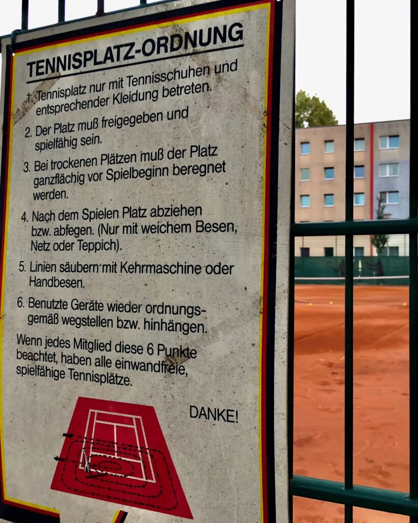 The rules posted on the courts of Tennisclub Berlin Mitte Albert Gutzmann, e.V. The city alleges that the club has been breaking ordinances of its own. For years, Berlin administrators say, the “Mitte” has been using four tennis courts on land owned by a school next door.