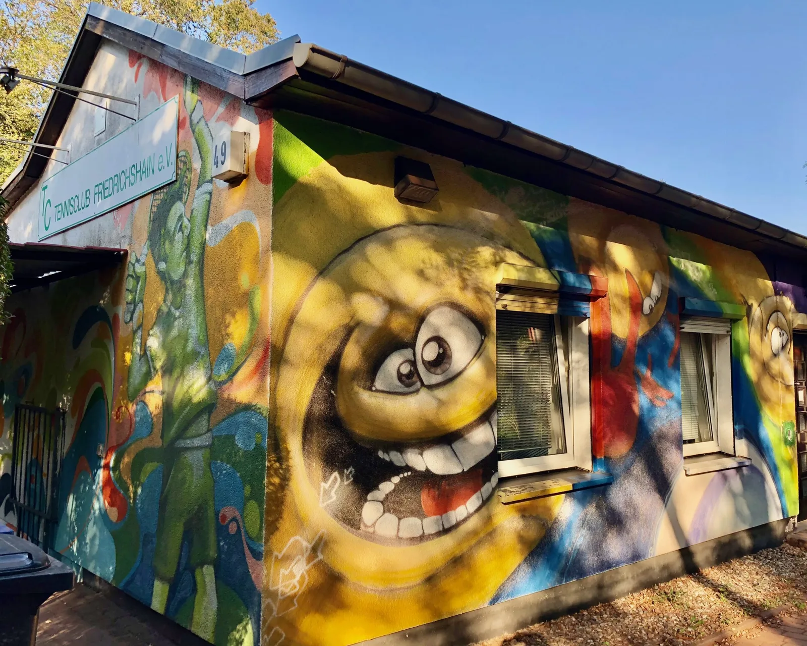 Detail from the graffiti wall outside the Tennis Club SV Berliner Brauereien e.V. The club runs 24/7 in the park and is a favorite for jet-lagged visitors who pay a nominal fee to play — until a member comes along and kicks them off.