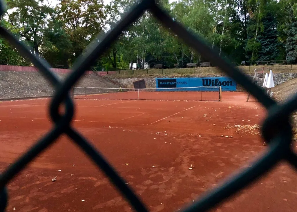 A fenced in section of the Tennis Club SV Berliner Brauereien e.V. The club’s seven outdoor courts are located in the Volkspark, or the ‘People’s Park’, which evolved from a World War II dumping ground. The park is just around the corner from a statue of Ernst Thälmann, a leading figure of Weimar Germany’s Communist party (KPD) killed in the Buchenwald concentration camp.
