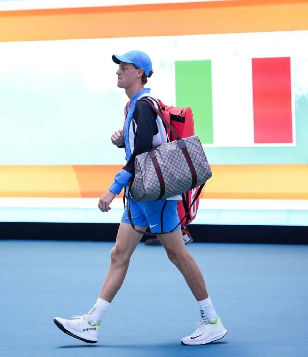 It was all eyes on 22-year-old Jannik Sinner as he returned to the big stage in Miami over the weekend. It was no surprise to see the iconic Gucci duffle bag slung over his shoulder, now becoming a style staple for the young Italian. A special detail he rocked at the last US Open? Straps with the tournament colours in-place of the iconic Gucci red green combo. A nice touch...